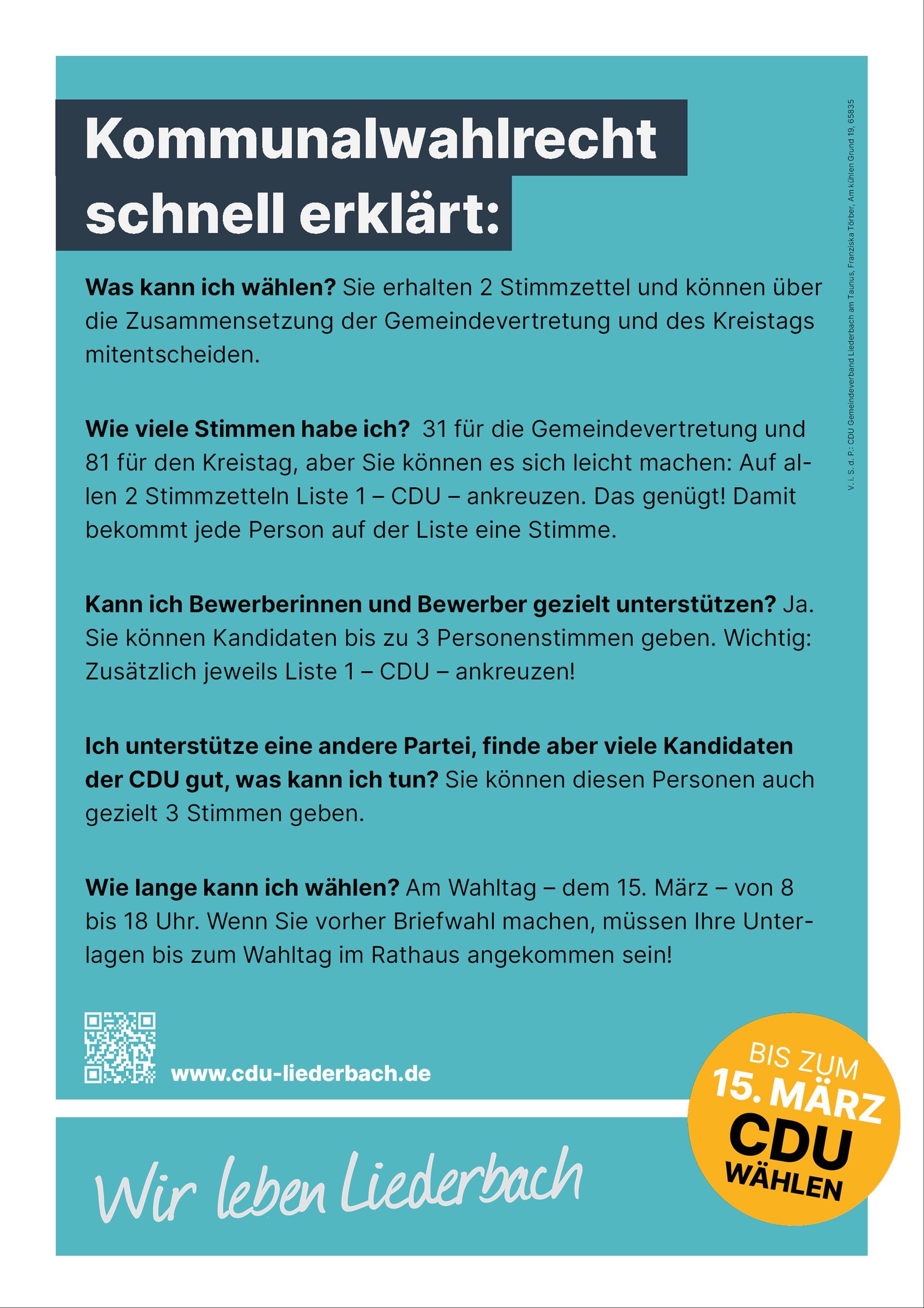 Am 06.10.2025 fand die diesjährige Mitgliederversammlung statt. Auf dieser wurde zum einen die Liste für die Kommunalwahl 2026 beschlossen (Details folgen) und zum anderen einen neuer Vorstand für die kommenden zwei Jahre (2025-2027) gewählt. Die zahlreich erschienenen Mitglieder haben wie folgt gewählt: Vorsitz: Franziska Törber Stellvertreter: Joachim Lehner, Markus Reinhart Schatzmeisterin: Doris Herbert Schriftführer: Günter Ramge Beisitzer: Elke Reuschel, Uwe Schreiber, Elke Vollmer, Sonja Weisgerber Mitgliederbeauftragte: Tanja Gasser An dieser Stelle gilt ein großes Dankeschön an den bisherigen Mitgliederbeauftragten Thomas Sterzel für seine Arbeit in den vergangenen Jahren. Die CDU Liederbach bedankt sich herzlich bei allen anwesenden Mitgliedern und Gästen. Der neue Vorstand freut sich auf die kommenden zwei Jahre.